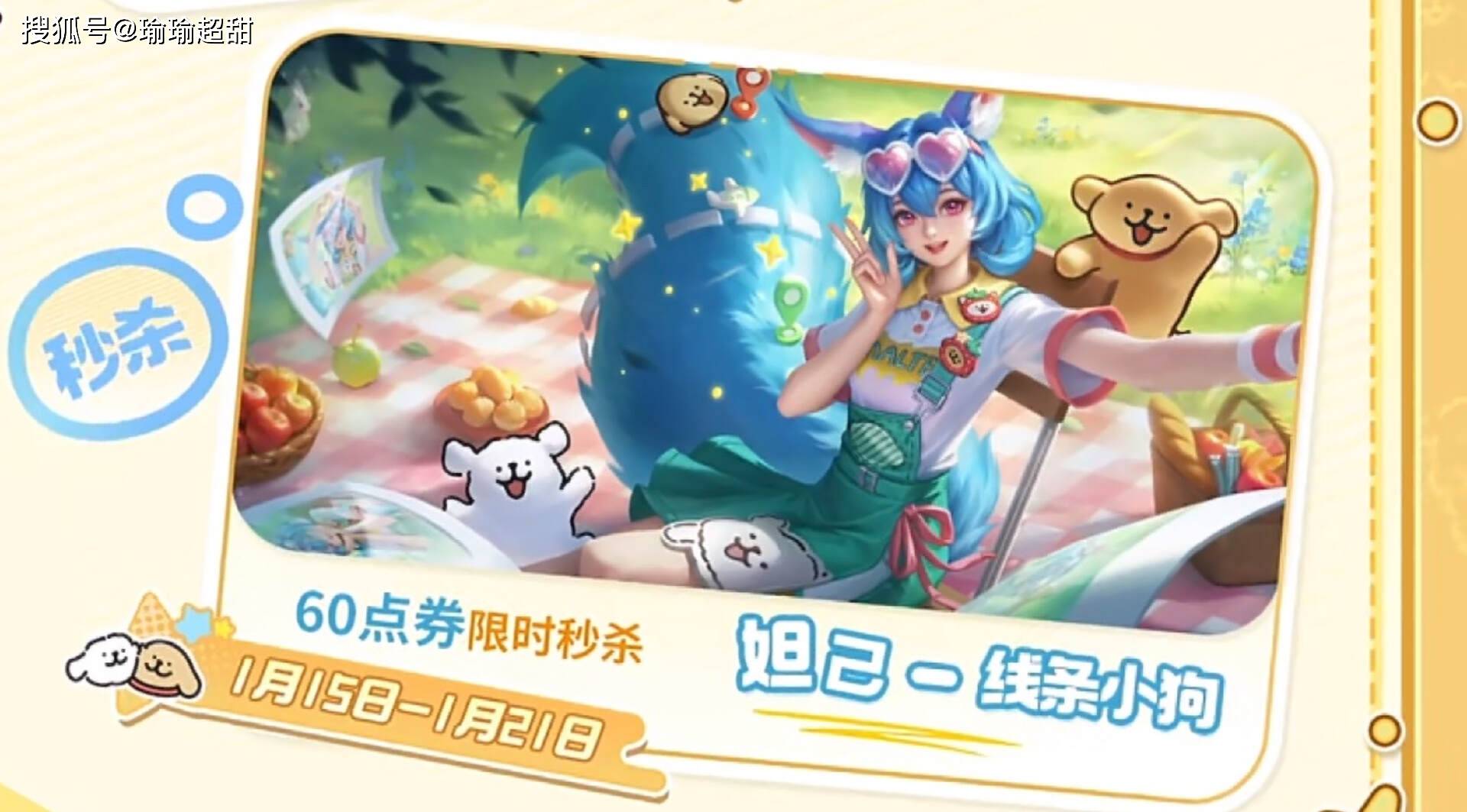 最后就是妲己也有一款 6 元秒杀皮肤,这款皮肤将会在 1 月 15 号至 1 月 21 号期间上线,只需要 60 点券即可拿下。并且这也是线条狗联动皮肤,大家可以看一下,整体的设计还是挺不错的。