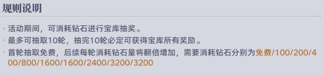 那么各位如果想要抽完此次活动,需要准备的钻石成本则为13500钻石......这个成本还是相当夸张的,换算过来也得值约两个648元的充值了,而经过实测其实下边5个奖励是很容易在前几轮优先出的,所以维一个人的建议是自愿不多的朋友可以抽个400钻石或200钻石之前的4轮或3轮来碰碰运气,运气不太好的话就不要往下抽了,毕竟800钻石以上的单次成本去换什么仙草礼盒或5万年拟态魂环就有点不太值了,当然这里也欢迎大家留言来展示一波战绩!
