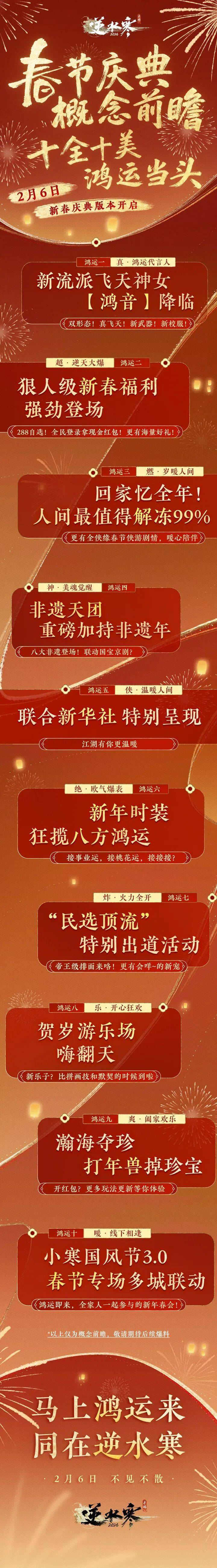 此外,《逆水寒》手游将打造新春鸿运版本,玩家将在 2 月 6 日正式上线的新版本中,感受来自逆水寒“十全十美”新年鸿运的“甜蜜暴击”,包括多项福利活动内容。IT之家附官方预热如下: