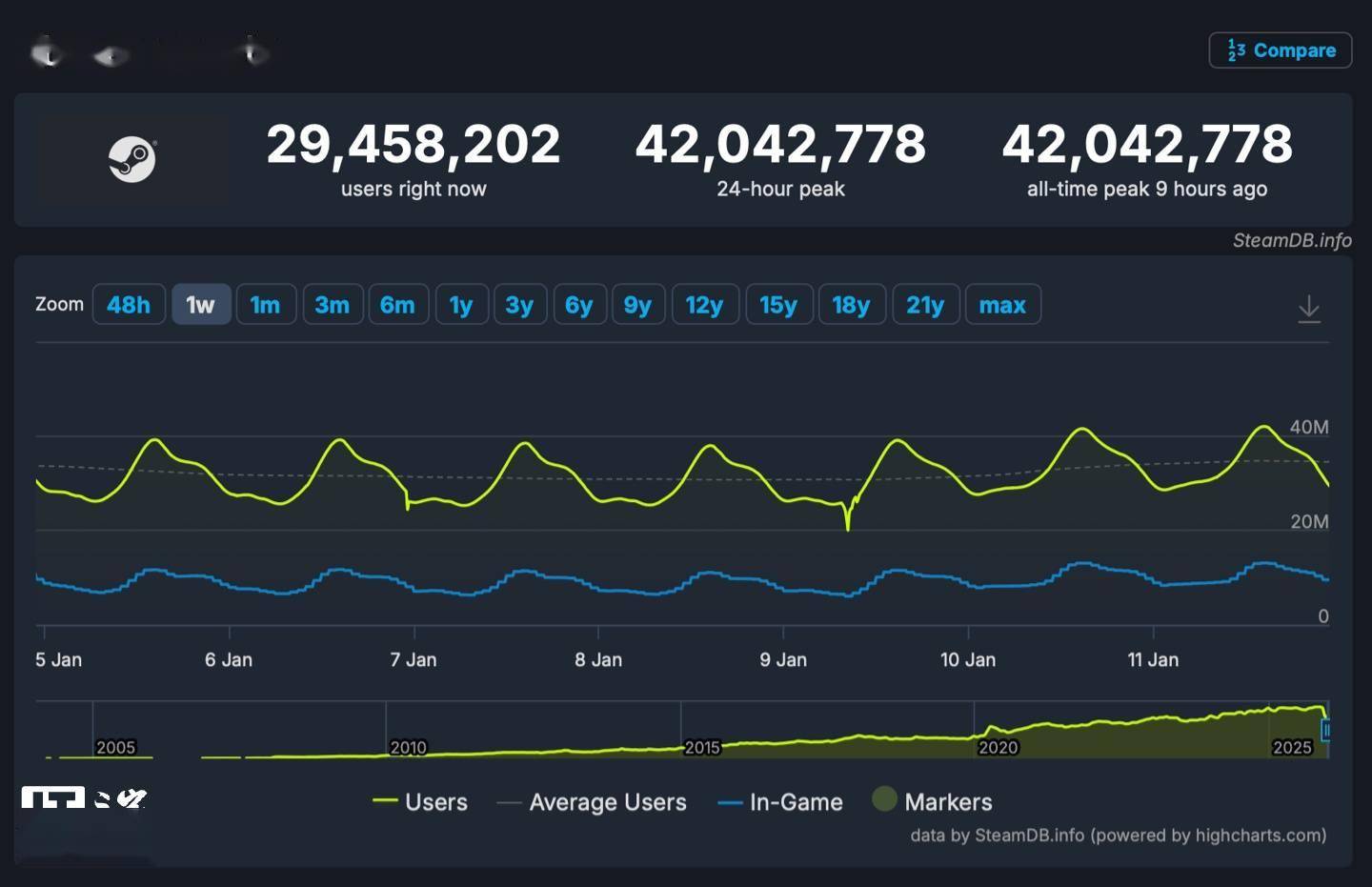 IT之家 1 月 12 日消息,SteamDB 数据显示,2026 年伊始,继此前突破 4181 万人后,Steam 在线玩家峰值数昨日迎来新纪录,该平台近 24 小时用户在线峰值达到了 42,042,778 (约 4200 万人)。