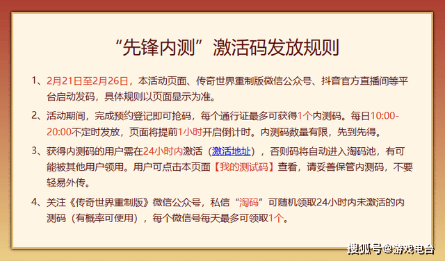 同时《传奇世界无双》先锋测试抢码火热开启,这场抢码大战堪称激烈!限量内测激活码一露面,瞬间就被汹涌的玩家热情“淹没”,手速稍慢就与它失之交臂,其抢手程度可见一斑。这般疯狂的抢码景象,淋漓尽致地展现出玩家对这款重磅重制游戏的热切期盼。要是你不幸错过上一轮抢码,千万别灰心!这里有份关键的激活码发放规则请查收: