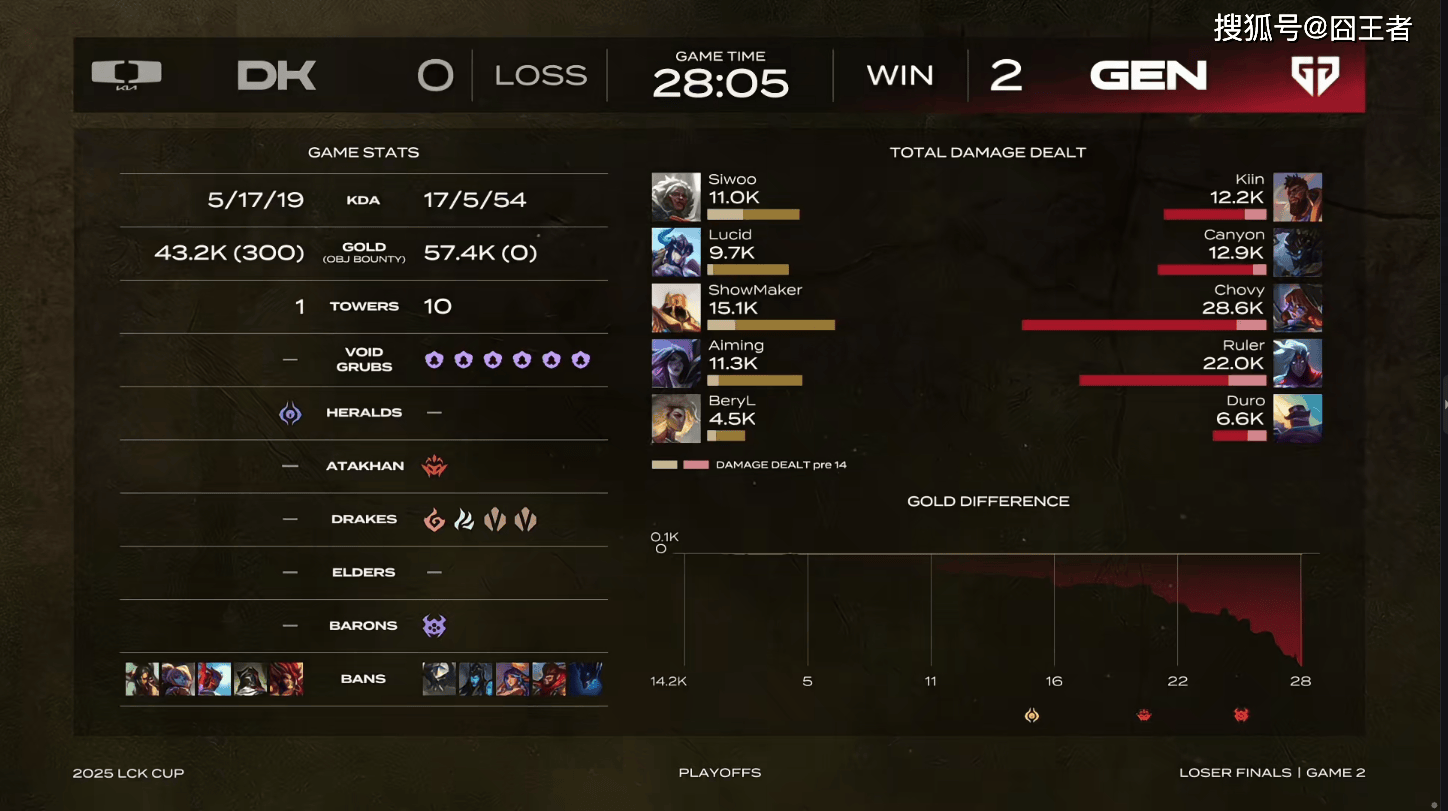 结果第二局比赛,又被GEN打成了单方面的碾压局,看来是找回了状态。比赛第16分钟左右,两队在中路爆发激战,DK先手秒掉Ruler韦鲁斯但后续团战GEN打出2换4大胜;比赛第21分钟左右,两队在下路爆发团战,GEN一波打出1换4大胜拿下厄塔汗;比赛第22分钟左右,GEN在中路找到机会打出一波0换3,此后GEN迅速将经济差距拉开到一万;比赛第25分钟左右,GEN在中路秒掉ShowMaker沙皇后拿下大龙;最终比赛第28分05秒,GEN带大龙Buff一波结束比赛,Ruler韦鲁斯收获三杀。