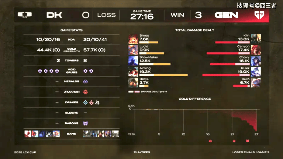 结果第三局比赛,前中期两队打得难分难舍,但进入中期后,依旧是被GEN打成了碾压局。比赛前期GEN取得微弱优势,比赛第17分钟先锋团ShowMaker瑞兹率先被秒,GEN一波打成2换3;比赛第21分钟左右,小龙团GEN远程消耗先击杀BeryL泰坦,随后GEN持续追击打出1换4大胜;比赛第25分钟左右,GEN埋伏得手瞬秒DK野辅,随后GEN拿下大龙;最终比赛第27分16秒,GEN一波打出0换4后结束比赛,Ruler艾希斩获三杀。