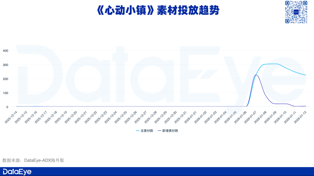 DataEye-ADX投放数据显示,《心动小镇》在1月上旬开始进行效果广告投放,日均投放量不足100条。直到上线当天,投放素材量有明显提升,而后持续提升。