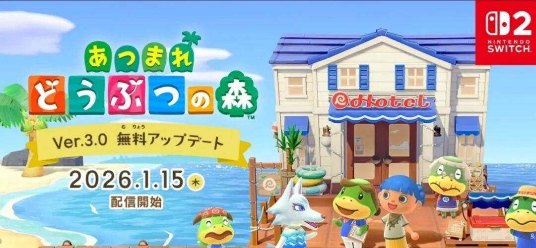 《集合啦!动物森友会》Nintendo Switch2版本将于2026年1月15日正式发售。同日,所有Switch及Switch2平台的现有玩家均可获得一次免费大型更新,新增度假酒店、岛屿共建等丰富内容。