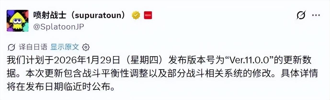 2026年1月29日发布《斯普拉遁3》的大型更新Ver.11.0.0。据称本次更新将包含平衡性调整及部分系统变更,而根据欧洲任天堂的公告,此次更新还将追加“新功能”。