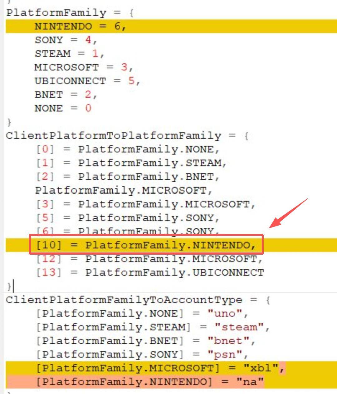 据数据挖掘者“RealityUK”发现,在启动器代码中,“Nintendo”已与索尼(PlayStation)、Steam、微软(Xbox)以及战网(BNET)并列,被列为可选的平台标识之一。
