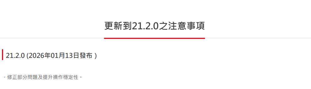 2026年1月13日,任天堂宣布NS/NS2系统更新至21.2.0版本。此次为小版本更新,官方并没有特别说明,仅表示修正部分问题及提升操作稳定性。