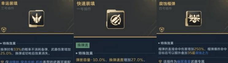 这里可以看到三种不同的插件,在它们效果的下面有特殊的提示;如幸运装填的仅适用于冲锋枪、突击步枪及机枪;腐蚀榴弹仅适用于幽冥毒皇;而没有特殊描述的快速装填则适用于所有武器。