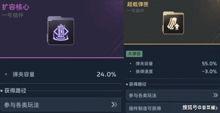 比如增加扩容性能的插件,紫色品质的扩容核心和金色品质的超载弹匣,差别就非常大,前者24%,后者55%。