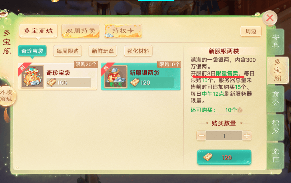 然后就是奇珍宝袋和新服银两袋了,奇珍宝袋是开区前三天的“启动加速器”,开服前3天,点券价格最低(约2.5万/点),160点的奇珍宝袋(限购20个)成本最低,120点的新服银两袋(限购10个),也只在开服前3天限量售卖。