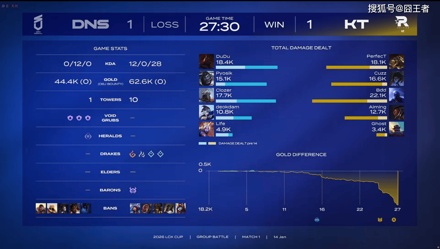 第一局比赛,D NS蓝色方,禁用:杰斯、沙皇、发条、安蓓萨、泰坦,选用:DuDu兰博、Pyosik猴子、Clozer阿狸、deokdam飞机、Life潘森;K T红色方,禁用:妮蔻、蔚、塞拉斯、洛、厄斐琉斯,选用:PerfecT奎桑提、Cuzz石头人、Bdd岩雀、Aiming芸阿娜、Pollu牛头