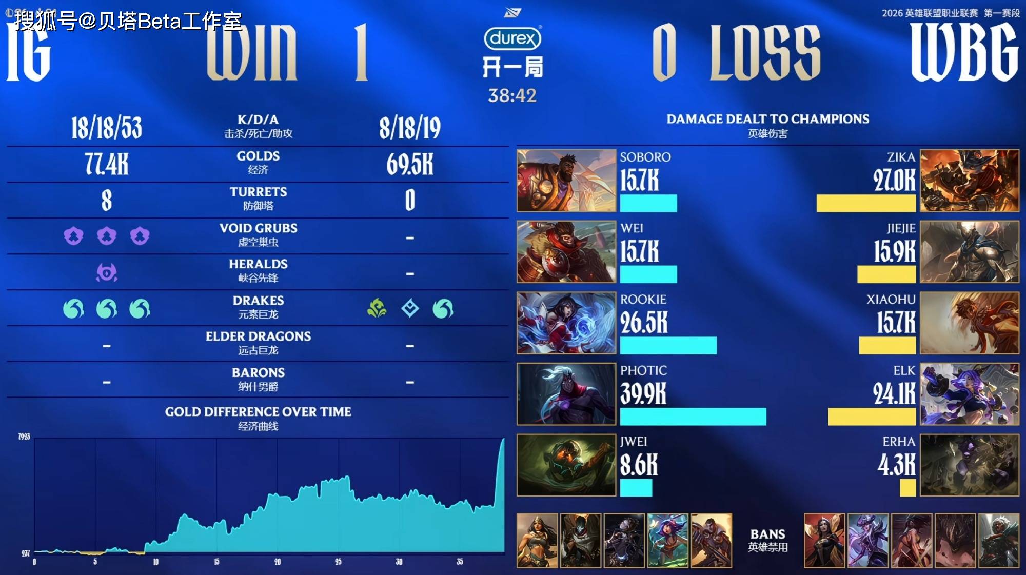 LPL第一赛段揭幕战IG和WBG的BO3,IG首发上单soboro,打野wei,中单Rookie,下路photic加Jwei,WBG上单Zika,打野jiejie,中单xiaohu,下路ELK加Erha。双方打满3局之后,WBG以2-1的战绩让一追二击败IG,拿下开门红!