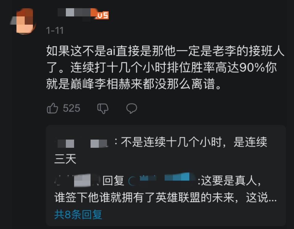 不过持相反意见的网友表示,发送表情包对AI而言并非难事,反观人类玩家,根本不可能连续高强度作战十几个小时却状态不减,还能维持90%以上的胜率。该账号的操作冷静得毫无破绽,完全不像是人类玩家的风格。