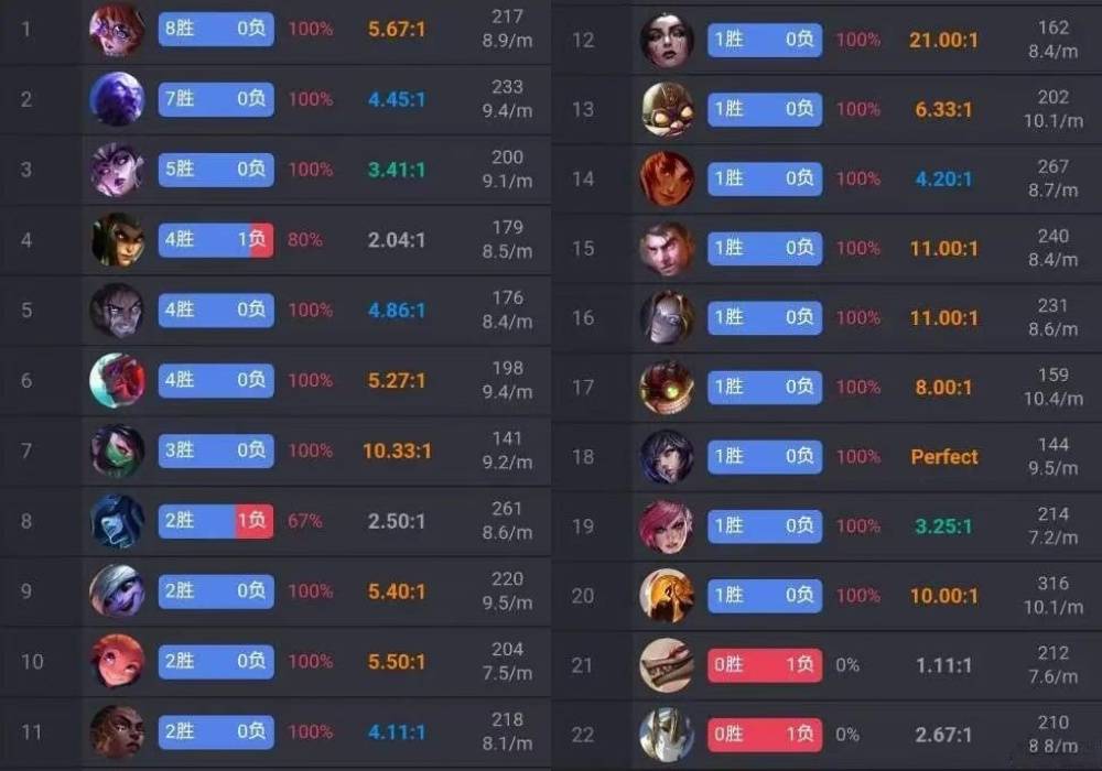 除了能在长时间高强度对局中保持超90%的高胜率,这位神秘玩家的英雄池还异常深厚——在56场排位赛中,其一共选用了22名不同英雄。