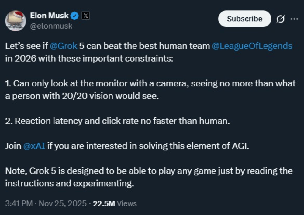 在2025年11月韩国传奇战队T1斩获《英雄联盟》2025赛季全球总冠军后,马斯克随即在X平台公开宣战。马斯克说,xAI旗下的Grok 5将在2026年以“人类级约束”规则挑战《英雄联盟》全球顶级战队。