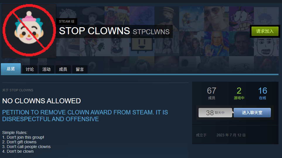 对于“小丑奖励”,国外玩家同样争议非常大,在Steam上甚至出现了公开抵制“小丑”的讨论组,理由也非常简单,这个奖励的存在只会助长社区里玩家互相攻击的风气: