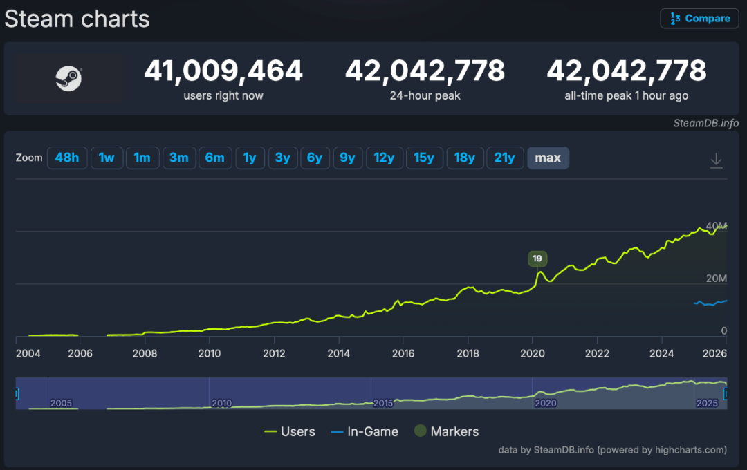 前两天,Steam平台的同时在线人数再创新高,根据官方公布的数据,在1月11日晚间,全球的平台同时在线人数首次突破了4200万: