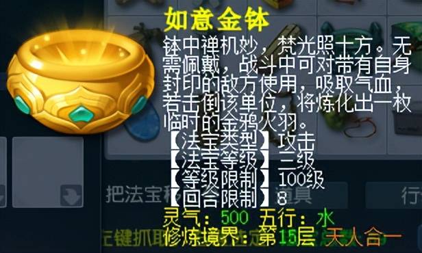 二是100级携带的如意金钵,这是攻击类型的主动法宝,可对带有自身封印的单位使用。若击倒对方,还能炼化一枚临时的火羽。