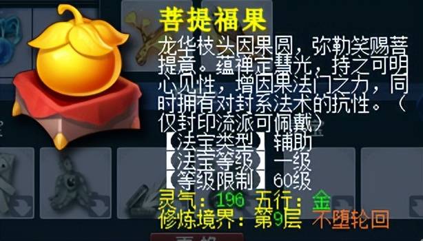 根据测试服现有情报,弥勒山目前只有2个法宝。一是60级携带的菩提福果,满层数可增加两级“善果园成”封印技能。