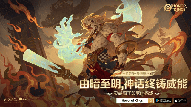 猴子新皮肤以东南亚神话中的神猴哈奴曼为原型,跳出传统“齐天大圣”设定,融入印尼哇扬皮影戏文化元素。皮肤背景讲述了哈奴曼灵魂封印于皮影门柱,战时显巨猿真身守护戏台的故事,叙事感浓厚。造型上,冲天发型尽显桀骜,技能特效摒弃华丽堆砌,以古朴皮影质感呈现,大招释放时还会浮现烈焰尾巴与幻影爪手,将传统艺术与英雄特性巧妙融合,史诗级品质拉满。