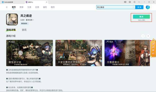 启动MuMu模拟器,在游戏中心搜索“风之痕迹”,点击预约,待游戏上线后即可畅玩。