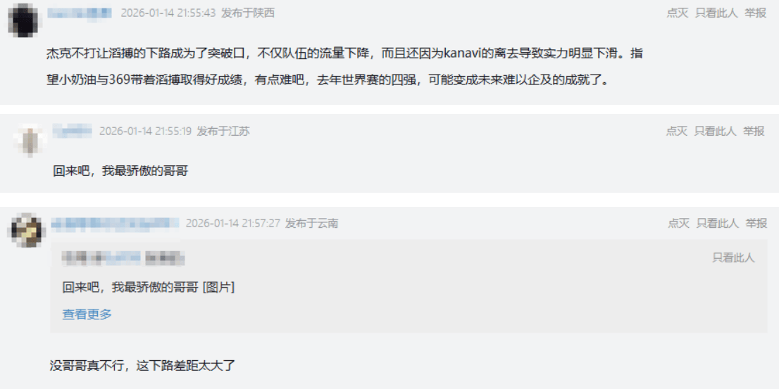 对此,网友表示:“杰克不打让滔搏的下路成为了突破口,不仅队伍的流量下降,而且还因为kanavi的离去导致实力明显下滑。指望小奶油与369带着滔搏取得好成绩,有点难吧,去年世界赛的四强,可能变成未来难以企及的成就了”、“回来吧,我最骄傲的哥哥”、“没哥哥真不行,这下路差距太大了”。