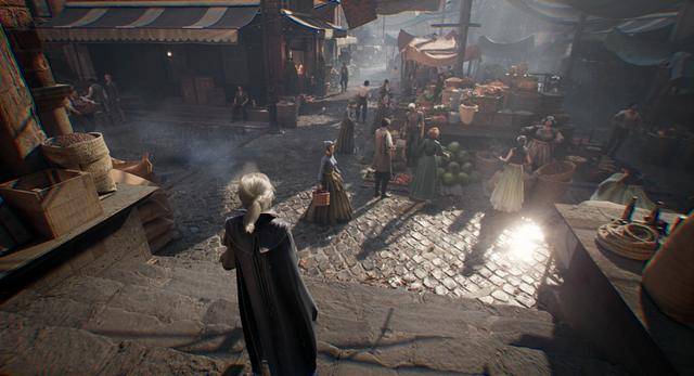 例如,对Lumen动态全局光照系统的熟练运用。视频里,铁十字街的遮阳布下有着细腻的光影过渡,水坑中的闪动和倒影也十分清晰,有着真实的光影氛围。而走过不同的场景,无论是大街上精致的地砖,还是铁十字街市场不同程度磨损的石板,这些细节都共同构建出接近物理真实的生活面貌,正是UE5引擎在光照与材质表现上的独特优势。