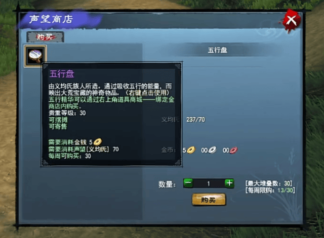 踏入大荒后,首先跟着主线任务稳稳升到14级,之后便是每天做日常任务。因为有了这日常声望,就可以去巴蜀地图的蜀州城!找到NPC“义均氏”,兑换五行盘寄售。