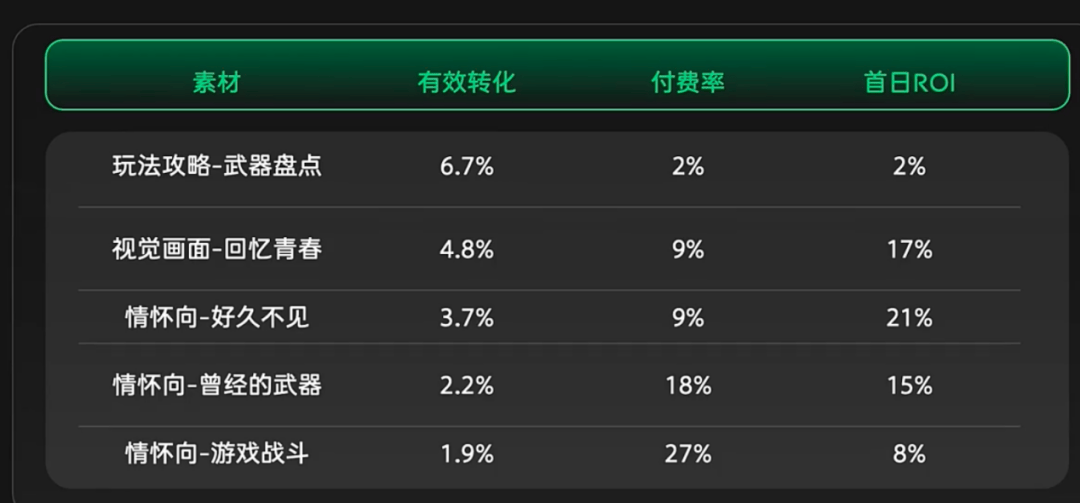 这是我们在投放测试中获得的一些素材数据。可以看到,侧 重于怀旧题材的素材,其转化率普遍偏低,难以吸引新用户——因为他们缺乏相关的情感共鸣。然而,这类素材吸引来的用户,其付费率与首日ROI表现却更为出色。