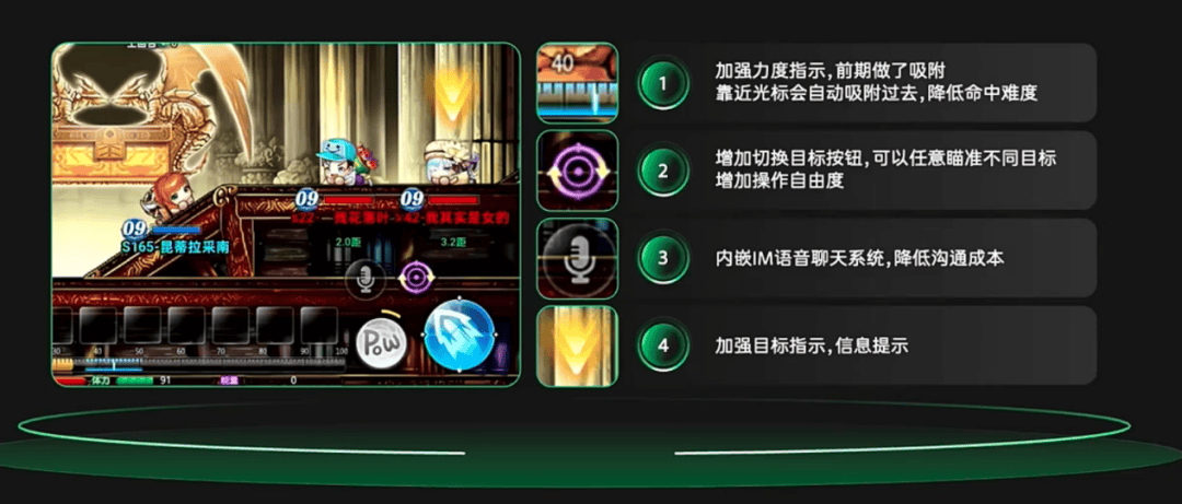 对于新用户而言,《新弹弹堂》的核心战斗——计算角度、力度与风速——是一大难点。为此,我们在游戏设计前期,我们加入了力度吸附功能,并在适当时机提供目标切换按钮,以提升操作自由度与命中率,改善新手体验。