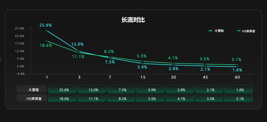 (上图)是两个项目(《大冒险》《H5弹弹堂》)在推广期的留存数据对比。通常手游的用户忠诚度会高于小游戏,但《弹弹堂》H5的60日留存达到了3.1%,是手游版本的两倍。