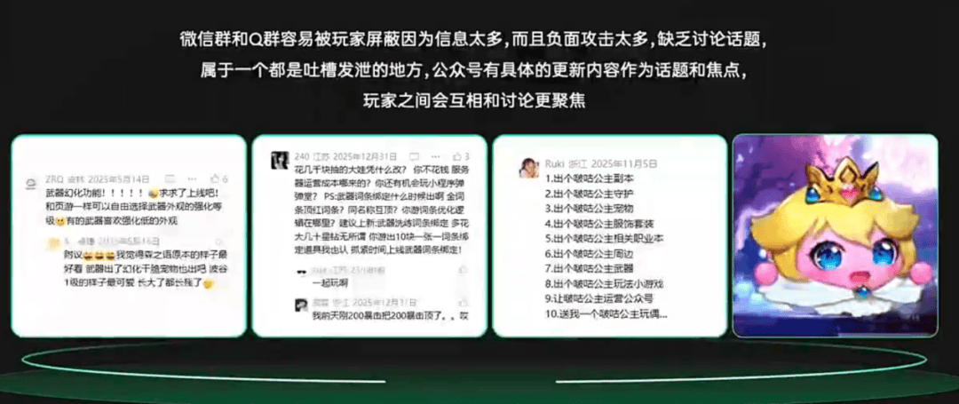 在社区运营方面,我们显著加强了微信公众号的维护与私域拓展。与公司过往项目不同,我们主动开放了公众号评论功能。初期,我们已做好接受批评的准备,但来自手游《大冒险》版块的用户评论大多理性温和。