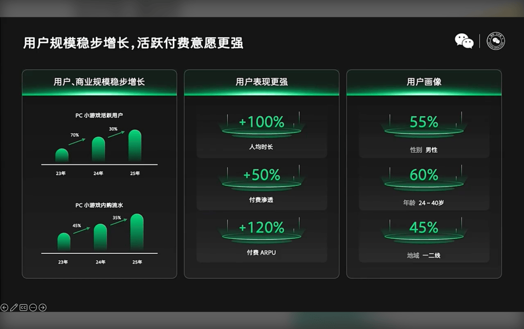 2025年PC 小游戏活跃用户增长了 30%,内购流水增长了 35%。付费渗透率增长50%,用户人均时长翻了一番。