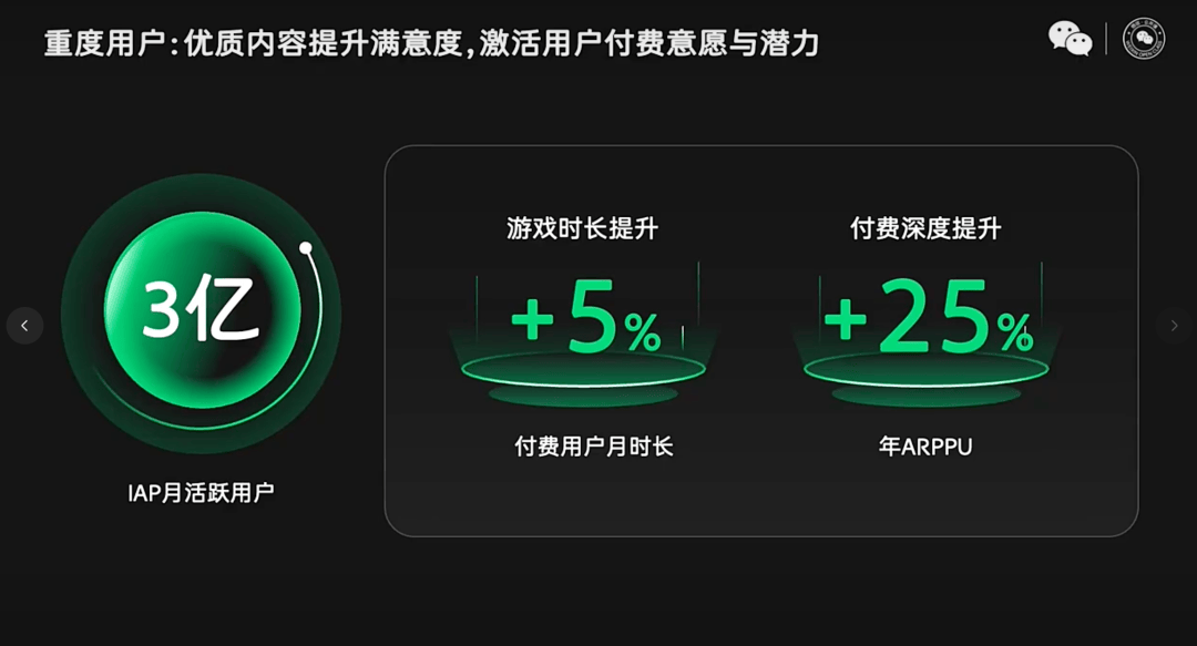 如果把用户画像拆分来看,2025年,IAP 重度游戏用户月活超过了3亿, IAA休闲游戏用户月活超 过4 亿。(注:微信小游戏总 MAU 为 5 亿,重度用户与休闲用户的MAU数据为分别统计口径,用户兴趣存在交叉。)
