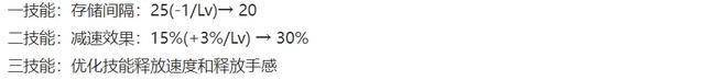 不仅一技能的存储间隔会从25~20秒改为20秒,二技能的减速比例也会从15%~30%改为30%,三技能的手感和释放速度还有优化。