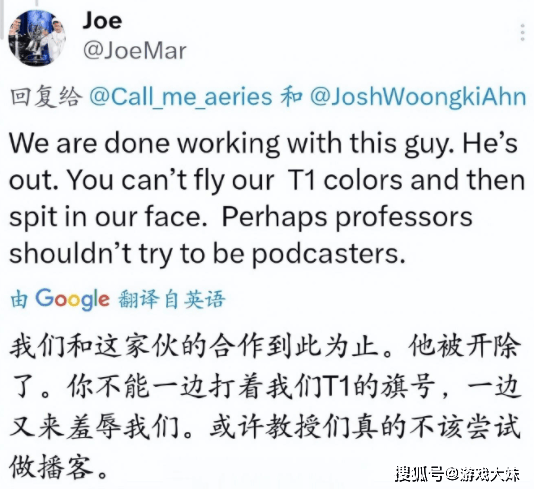 面对迅速扩大的风波,T1的反应堪称“教科书级别”,CEO赵麻石(Joe Marsh)第一时间在社交媒体发声,直接表态与该人员终止合作,并明确说明其已被开除,这种光速切割,既是对粉丝情绪的回应,也是在向外界划清界限:个人观点不代表俱乐部立场,T1对Faker的尊重不存在任何模糊空间。