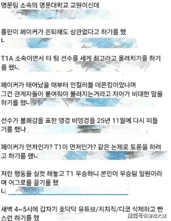 事情的起因,来自T1旗下三队T1.A的一名电竞研究员。近期,这名工作人员过往在网络上的言论被韩国网友翻出,其中多条内容直戳T1乃至整个LCK最敏感的神经,包括“Faker早在2022年就该退役”“没有Faker的LCK也能正常发展”,以及“Chovy才是英雄联盟历史第一人”等观点,单拎出来看,这些或许还能被归为个人立场,但当它们同时出现在一位T1体系内部工作人员身上时,性质立刻发生了变化。