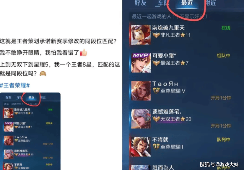 有玩家表示,自己当前是王者8星,但实际对局体验却像坐过山车:一晚上赢一把输两把,状态极其割裂,更关键的是队友段位分布非常离谱——同一局中,既能遇到王者20星的高段位玩家,也能遇到星耀四、星耀五的队友,按照官方此前的说法,外显段位匹配应该控制在一个相对稳定的区间内,上下浮动有限,但现实却像是“老剧本重演”,和旧机制并没有本质区别。