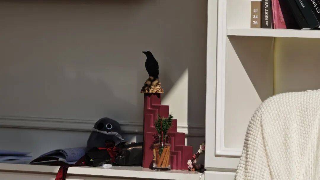 卧室床边的书架上,除了书,还摆有乌鸦以及乌鸦玩偶(男主秦彻身边常伴一只名为梅菲斯特的乌鸦);