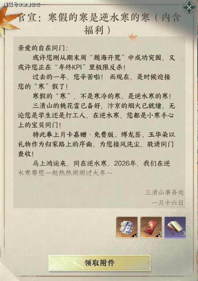 1月16日,很多《逆水寒》手游玩家上线后,惊讶的发现官方悄悄给自己发了一封新邮件。而邮件的内容则是意外的“寒假福利”。包括一张免费月卡、三个缚龙签和三个玉华染。