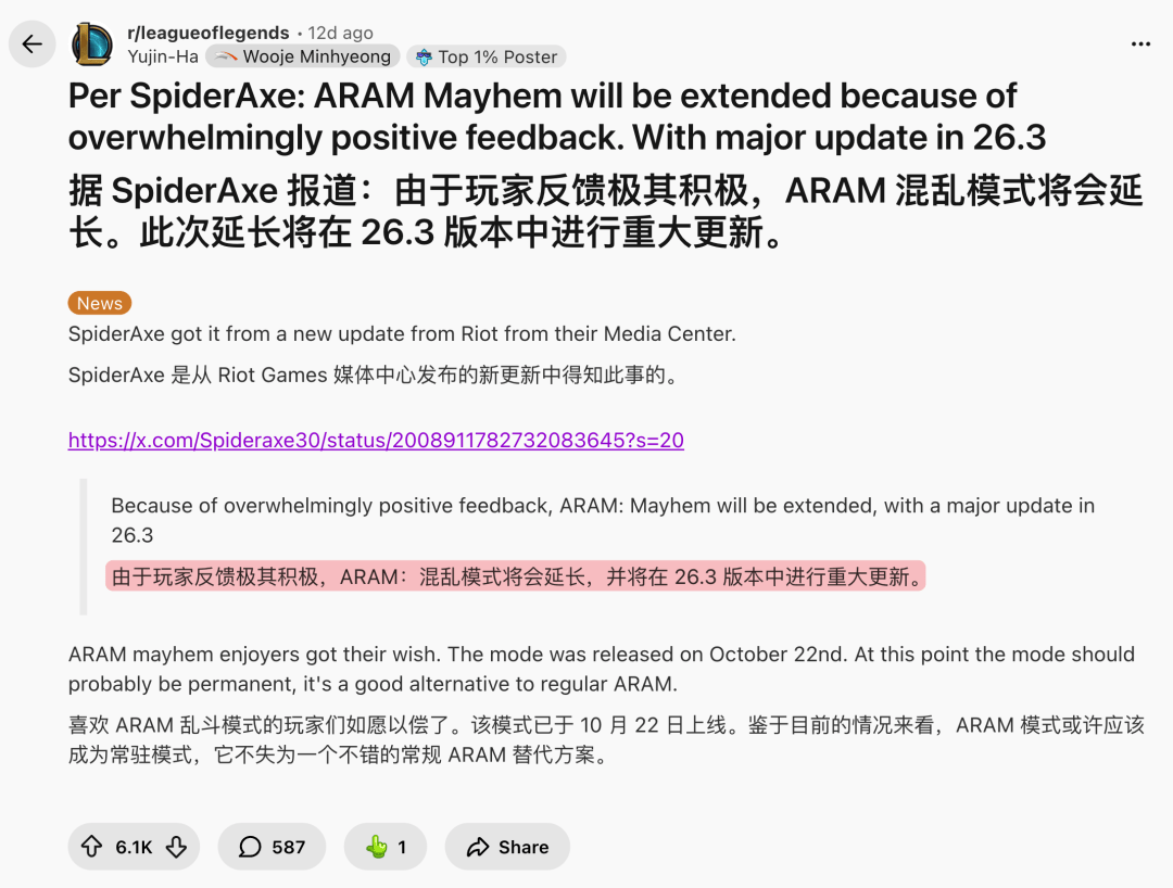 该说不说,这段时间,LOL 玩家们好像回到了十几年前刚接触游戏时,那个天天查攻略、分享套路的年代,到处都是新鲜感,哥们每天上班都心痒痒想整两把。