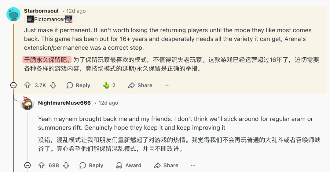就算对局输了,但你在随机性中完成了“万血蒙多”,“1000 移速 ADC”,“出了破败的 AP”。这些全新体验,能给到你额外的爽感,这是传统大乱斗压根做不到的事情。
