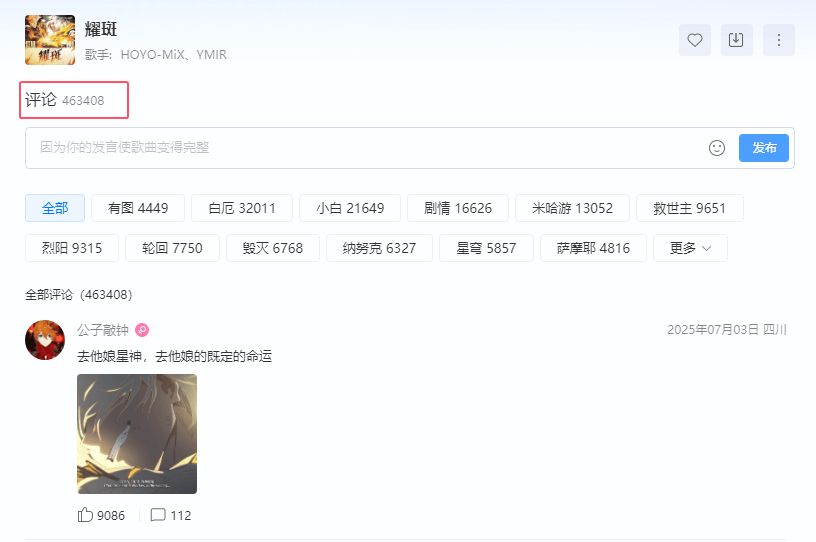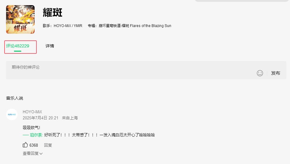 翁法罗斯的音乐不仅播放量能打,它在各大主流音乐平台上的评论数据表现也极为亮眼。以《耀斑》为例,仅国内QQ音乐、酷狗音乐、网易云音乐三大主流平台,累计评论数就逼近百万条。