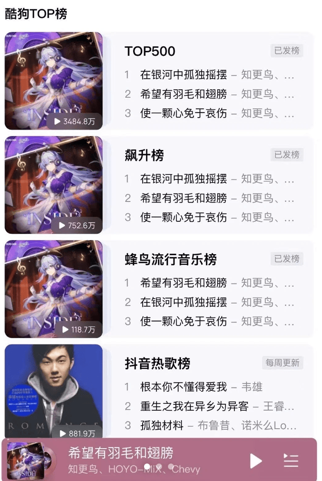 就拿翁法罗斯版本的歌曲来说,几乎承包了二游音乐榜的半壁江山!在各大UP主统计的榜单中,《拂晓》《何者》《耀斑》三首歌清一色斩获2000W+播放量,强势冲进前五之列,实力碾压同期作品。