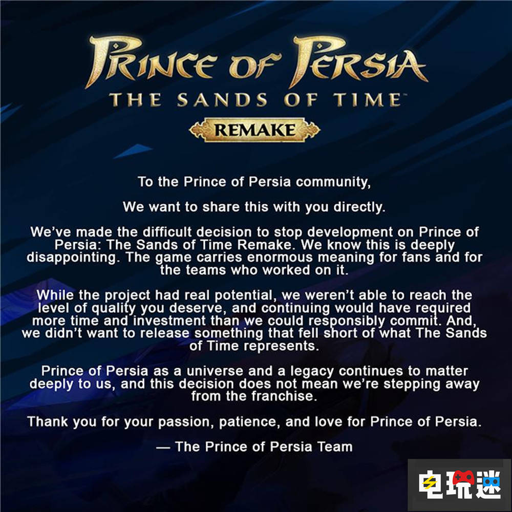 对于被取消的《波斯王子:时之砂 重制版》,官方开发团队在社交账号发文表示该项目曾经拥有很好的潜力,但是因为他们的成果并没有达到应有的品质标准,继续开发所消耗的时间与投入已经超出可控范围。他们也不愿意凑数的推出有损《波斯王子:时之砂》之名的游戏作品。