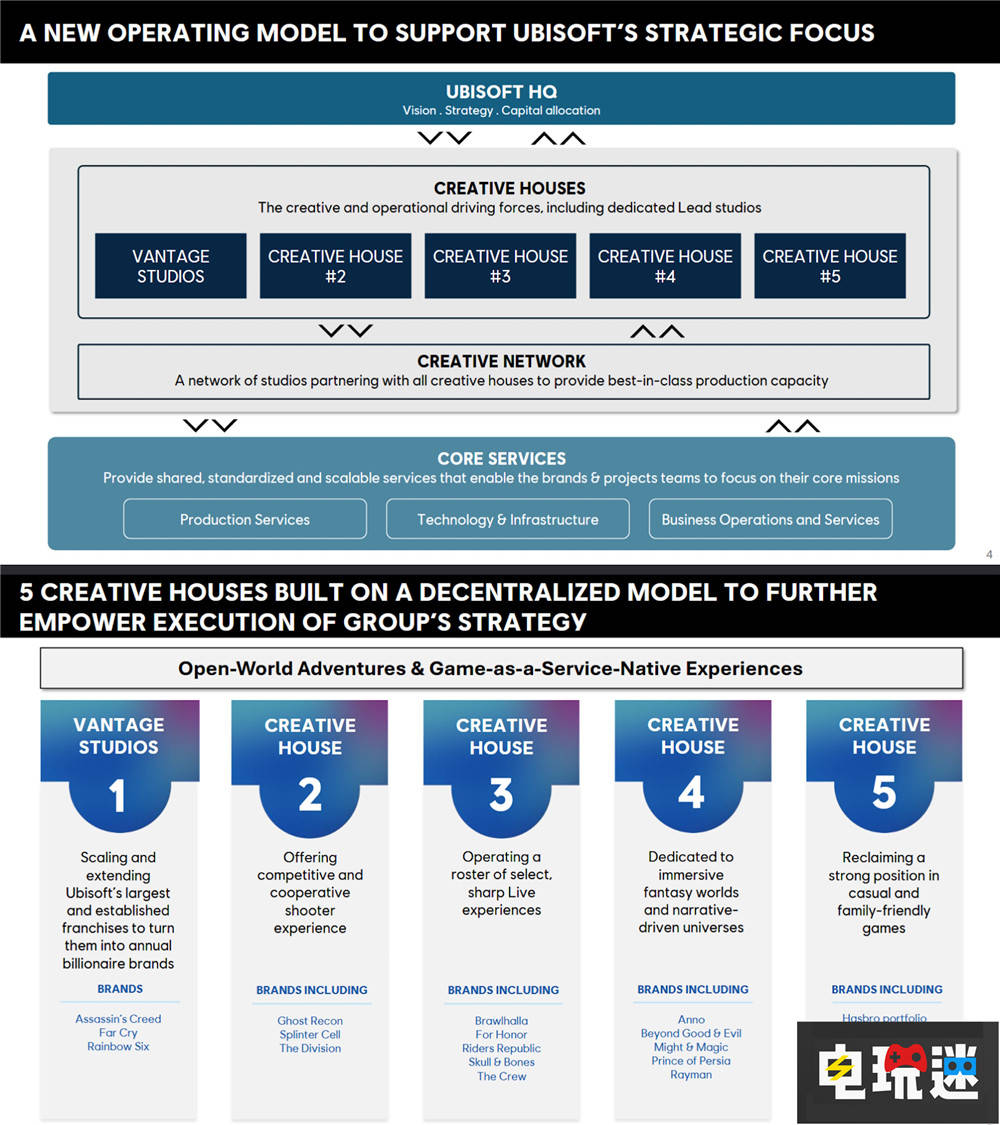 育碧首席执行官伊夫·吉勒莫(Yves Guillemot)表示育碧本次内部结构重组的重点是“创意中心”(Creative Houses),育碧将每一个创意中心的生产与发行整合为统一的业务单元,从而整合旗下作品的玩家关系。