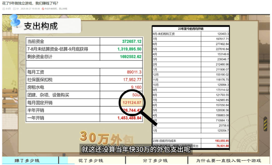 为了换取信任,团队做到了极致的透明。他们在B站定期公开公司的经营状况,收入多少、支出多少、奖金怎么分,甚至精确到小数点后两位。这种操作在一般公司看来简直是不可想象的,哪怕是再小的独游团队,你都很难见到这样做的。
