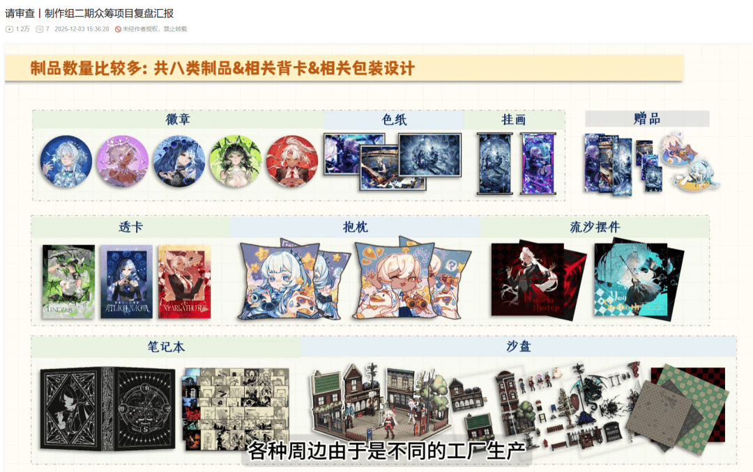 中间他们搞的第二次周边众筹,因为缺乏供应链经验吃了亏。团队起初只想做个简单的谷子,结果后来又是加色纸,又是加抱枕,最后还想做笔记本,光SKU就规划了15种,实际生产了10种。
