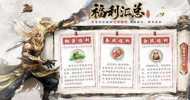 买了还不算完,同期还有“购买福利”活动,入手九州神骏礼包就有机会拿到最高3万点魔石的返利,随机倍率加上隐藏的“财源滚滚”翻倍机制,运气好的兄弟简直血赚。养成年兽也能“回血”,通过“神骏星临”玩法养成,每次都会返“聚宝金符”碎片,有机会开出1000点、500点等额度的魔石。